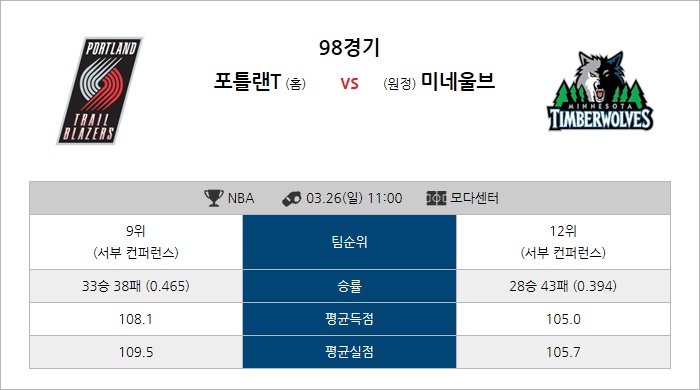 (NBA) 3월 26일 포틀랜드 트레일 블레이저스 VS 미네소타 팀버울브스 경기분석