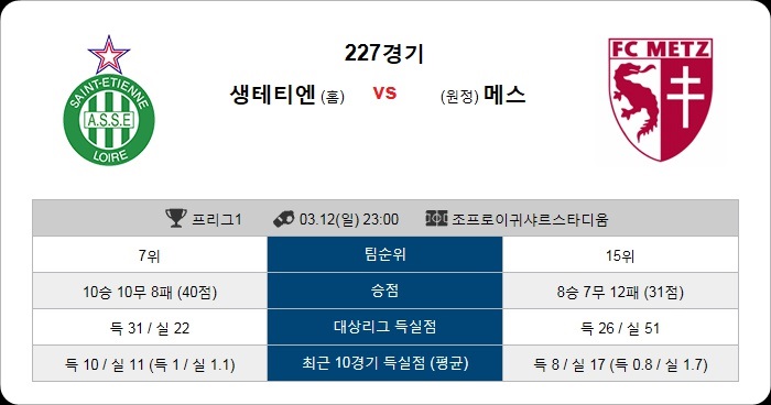 3월 12일 [ 르 샹피오나 ] - AS 생테티엔 vs FC 메스 분석.