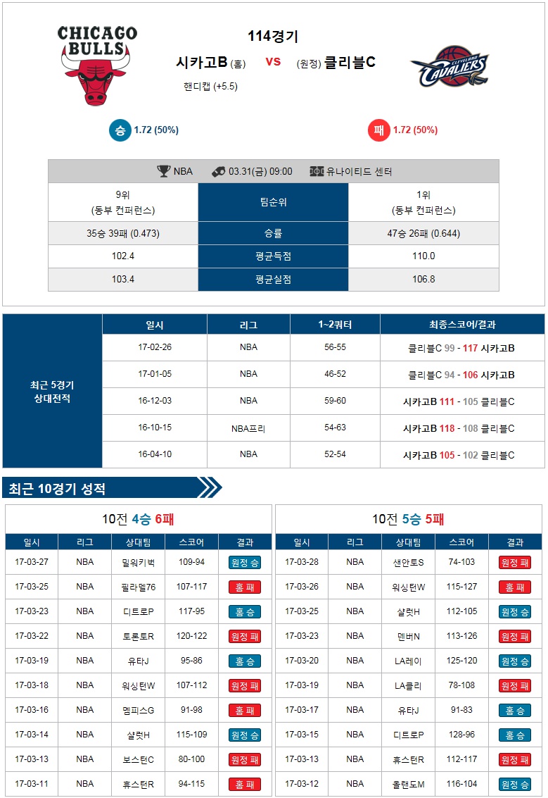 (NBA) 3월 31일 시카고 불스 VS 클리블랜드 캐벌리어스 경기분석